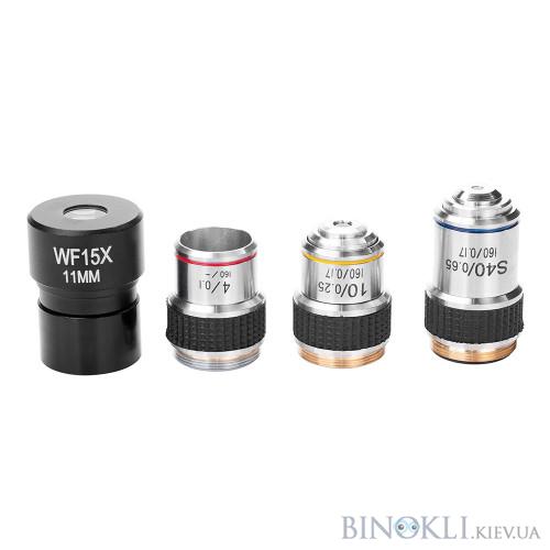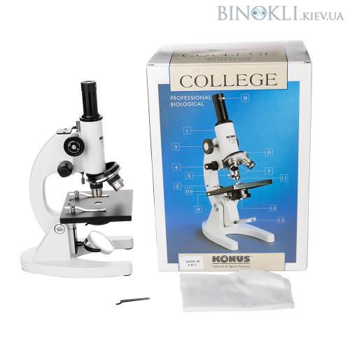Біологічний мікроскоп KONUS College 60х-600х призначений для оснащення шкільних кабінетів біології, лабораторій університетів і професійних коледжів. Комплектація моделі включає в себе 15-кратний окуляр і 3 ахроматичні об'єктиви кратністю 4, 10 і 40х (останній - з пружинною оправою для запобігання зіткнення зі зразком при фокусуванні). Таким чином, в базовій комплектації мікроскоп здатний працювати при збільшеннях 60, 150 або 600х.